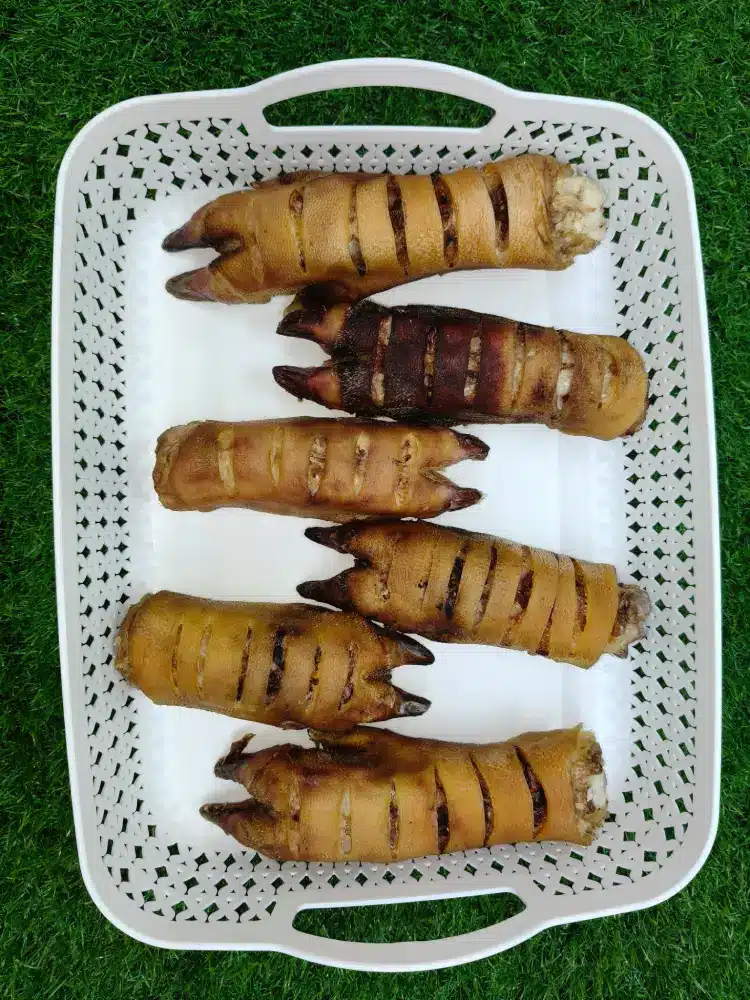 We source local farm. fresh meat select & whole pork bones we cutting and cleaning process separate method. Dry our pork trotter bone chew at low heat to retain nutrients and texture.